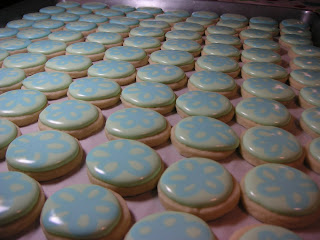 Yesterday I spent a good part of the day baking 2 inch round cookies for tasting samples for the bridal show this coming Friday night. Today has been one long day icing the 500 cookies.